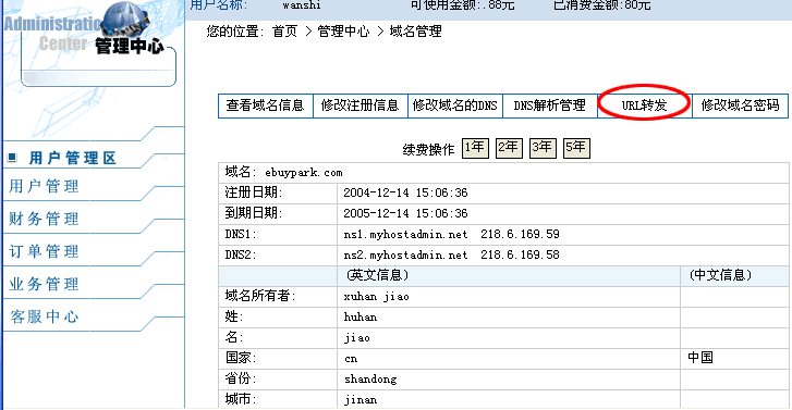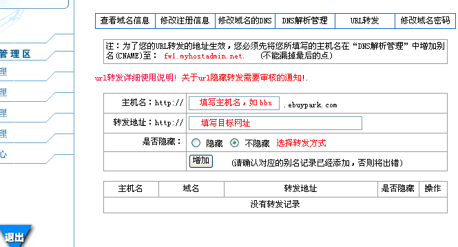 域名解析演示视频 域名转发演示视频 URL转发是指当用户在浏览器输入某个域名时,打开此域名对应的另外一个网址.例如,将http://bbs.ebuypark.com转发到http://www.ebuypark.com/bbs时,用户输入bbs.ebuypark.com访问的实际是www.ebuypark.com/bbs的内容. 转发方式有两种:隐藏与非隐藏,采用隐藏转发时,用户在浏览器地址栏看到的是原来的域名,如上例,用户输入bbs.ebuypark.com时访问的虽是http://www.ebuypark.com/bbs的内容,但浏览器地址栏显示的还是"bbs.ebuypark.com",而采用非隐藏转发时,浏览器地址栏将显示实际地址http://www.ebuypark.com/bbs. 我司注册的域名支持隐藏与非隐藏转发,但隐藏转发需要通过审核才能生效!