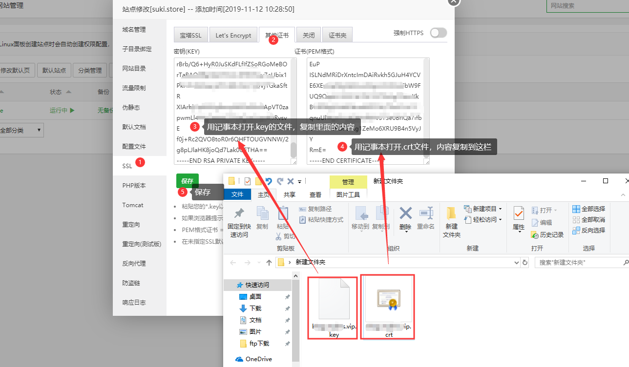 宝塔面板上编辑站点,点击SSL,用记事本打开下载后的证书,复制对应内容,保存然后重启web服务。