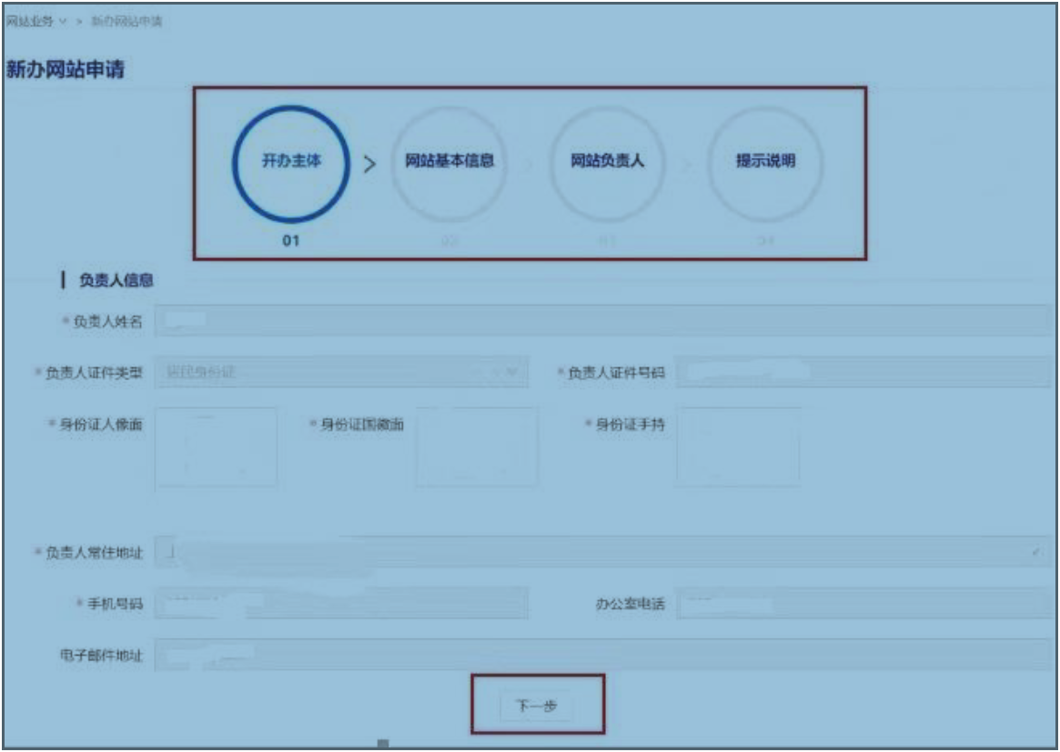 4.2. 网站业务 4.2.1 新办网站申请 新办网站申请包含四步:【开办主体】、【网站基本信息】、【网站负责人】、【提示说明】。 点击菜单栏左侧的【新办网站申请】按钮,进入新办网站页面。分步填写相关信息,第一步展示所属主体信息,主体信息只读模式不可修改。点击下一步,依次进入网站基本信息、网站负责人、提示说明。信息项前面带有红色“*”号标记的为必填项。截图如下:
