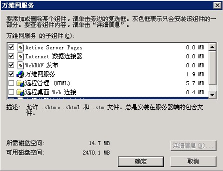 6、勾选“Active Server Pages”、“Internet 数据连接器”、“WebDAV 发布 ”、“在服务器端的包含文件”,然后一路点“确定”,最后点“下一步”开始安装,如图: