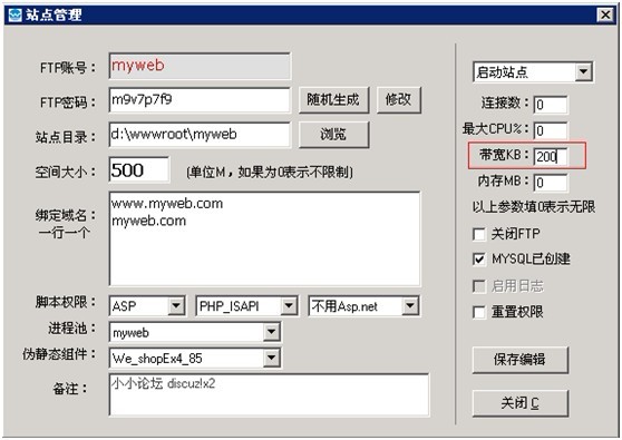 如果需要更详细的统计,可以下载http://downinfo.myhostadmin.net/iis-Monitor.rar 软件来统计。 通过总的web收发大小可以看出哪个站点的流量大,并进行整改。 流量异常处理方法: 查出某个站点太占用带宽,可以在网站管理助手设置带宽大小,如图: