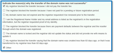 注册商拒绝转移,因为我没有支付转移费用。 (如果原注册商要求收取转移费用或必须续费一年才给转,就选择上这一项)