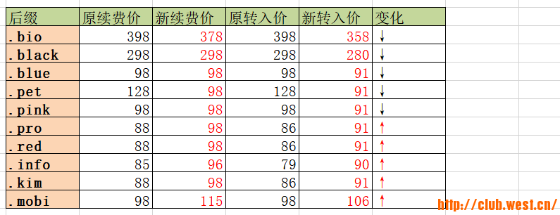 1. 为避免您不必要的额外支出,对于涨价的域名,建议您在以上涨价时间之前尽快完成注册、续费、转入。